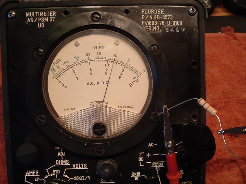 For demo purposes, here is a reconditioned PSM-37 measuring a 1K ohm resistor on the "times 100" scale. The needle is directly above the 10 - Exactly 1000 ohms! This was done to show my meters are fully operational not on just some functions, but on ALL functions.